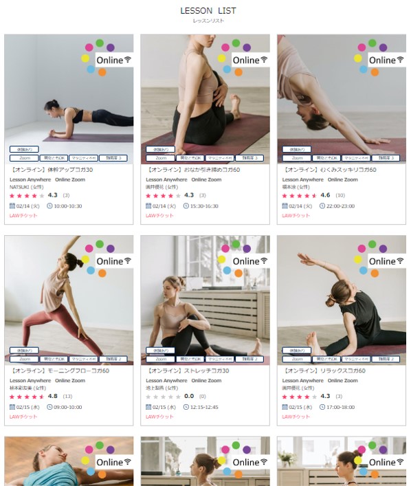 ーオンラインレッスンの開催数が少ないーLAWのレッスンは早朝から深夜まで、またレッスンのバリエーションも豊富。